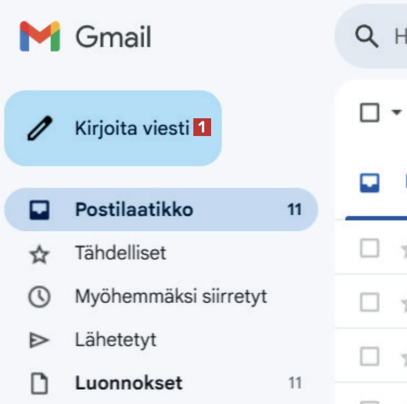 Avaa gmail.com selaimessa ja valitse Kirjoita viesti 1. Kirjoita sitten uusi viesti.