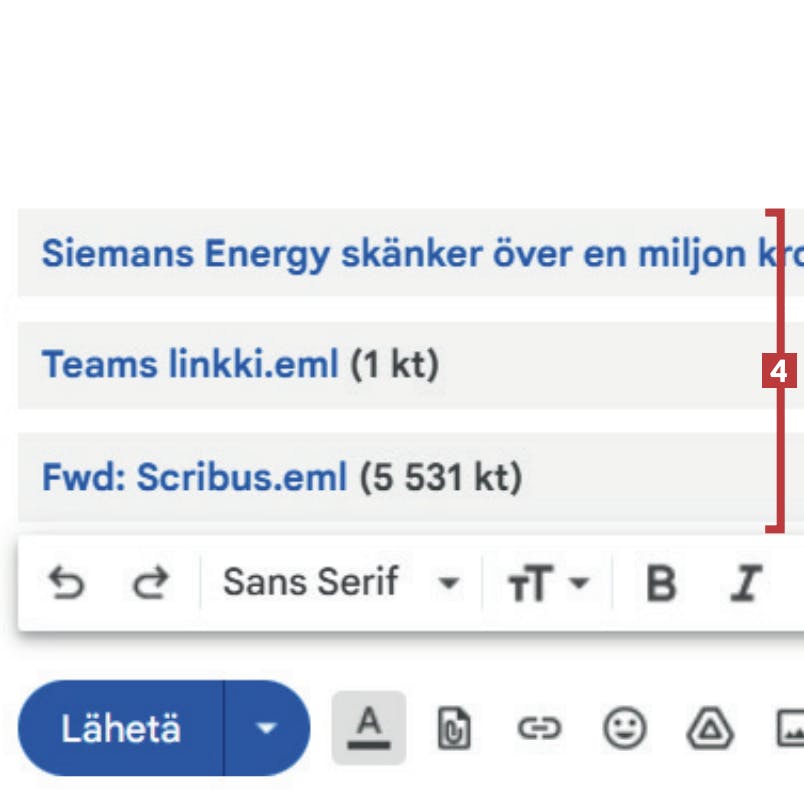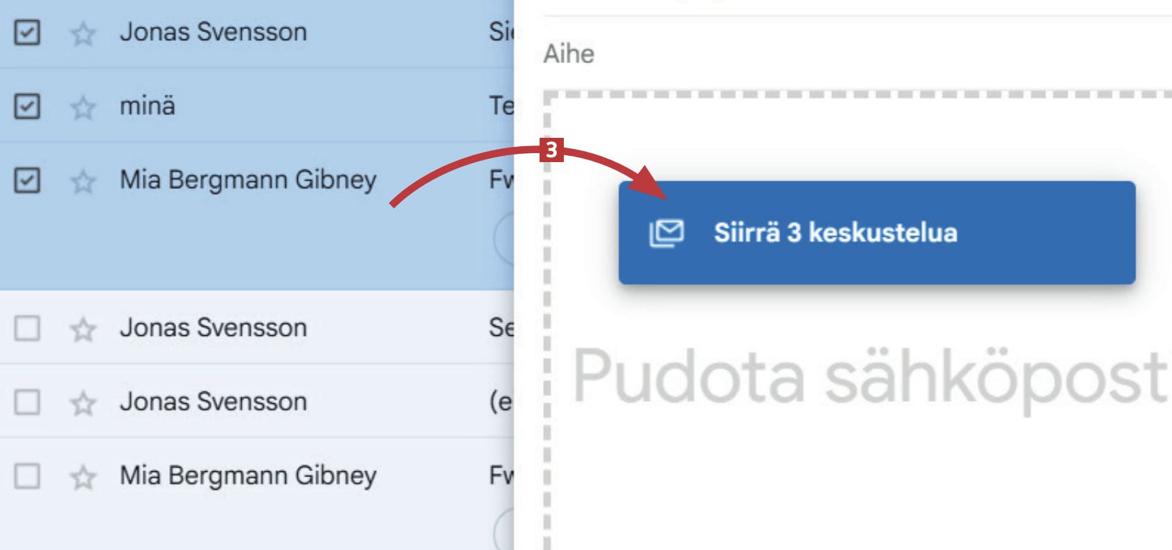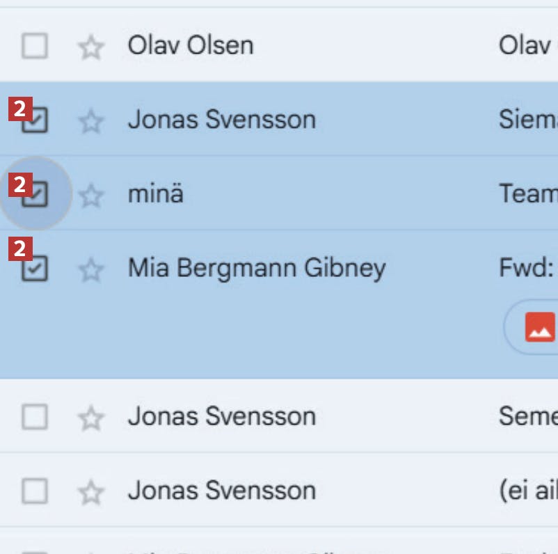 Merkitse nyt Gmailin postilaatikossa 2 ne viestit, jotka haluat liittää sähköpostiin liitetiedostoina.