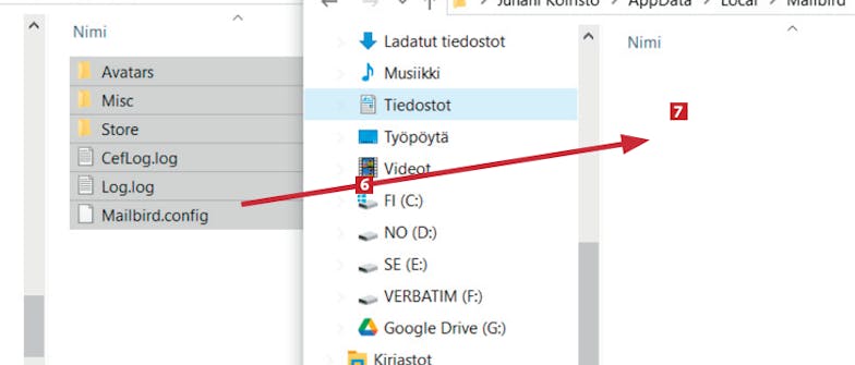 Kirjoita osoiteriville C:\users\käyttäjätunnus\AppData\Local\Mailbird 3 siten, että käyttäjännuksen paikalla on oma käyttäjätunnuksesi. Paina Enter-näppäintä. Kansion sisältö näytetään.