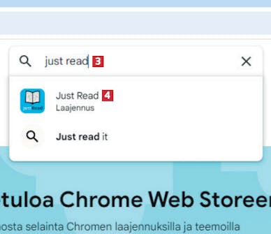 Kirjoita hakukenttään laajennuksen nimi 3 ja napsauta hakutulosta 4 tai paina Enter-näppäintä nähdäksesi muut hakutulokset.