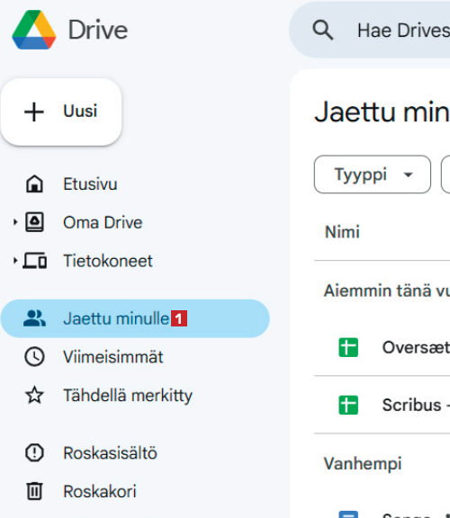 Avaa drive.google.com selaimessa. Napsauta vasemmanpuoleisessa valikossa kohtaa Jaettu minulle 1. Näet kaikki tiedostot, jotka sinulle on jaettu.