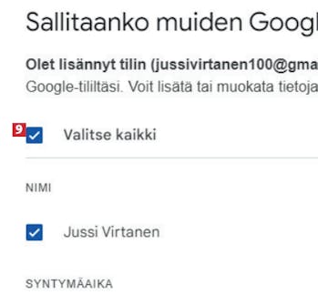 Merkitse sitten kohta Valitse kaikki 9. Näin Google ottaa huomioon kaikki Google-tiliin liitetyt tiedot, kuten puhelinnumeron.