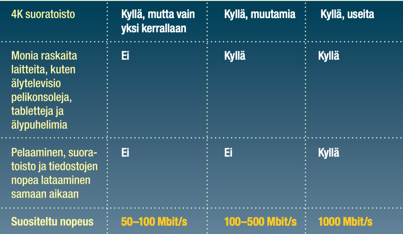 Taulukostamme saat käsityksen siitä, kuinka suuri nopeus on tarpeen riippuen siitä, kuinka monta ihmistä kotitaloudessasi on, kuinka moni on yhteydessä internetiin ja mitä teet verkossa päivittäin.
