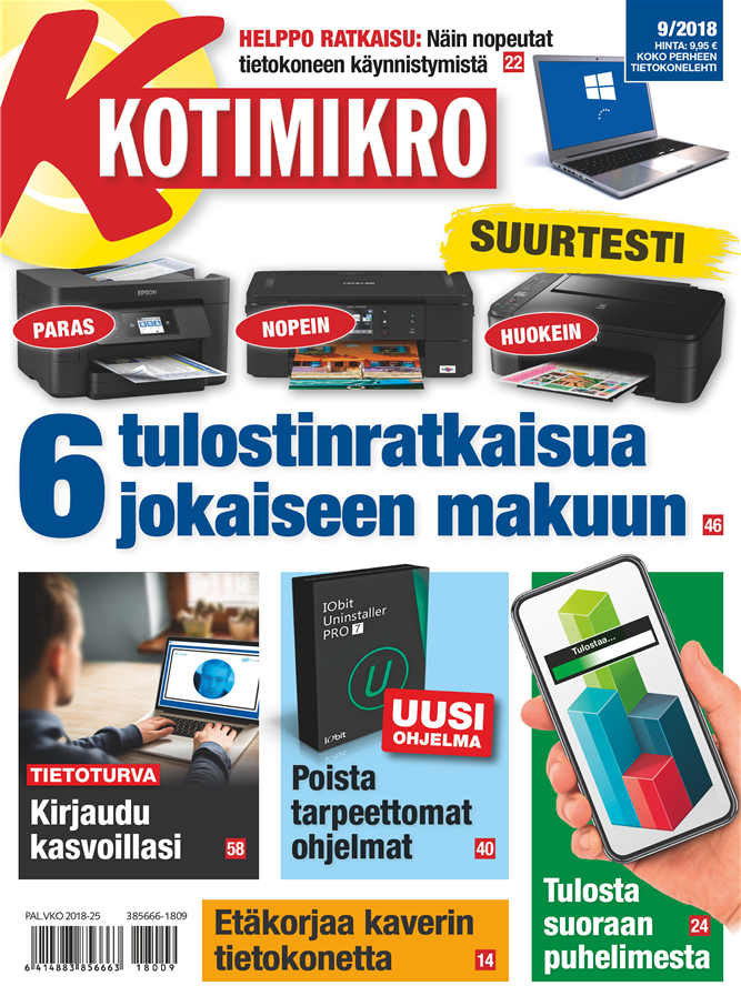 KotiMikro 9/2018 neuvoo myös kolme helppoa tapaa lähettää valokuva tai asiakirja puhelimelta tai taulutietokoneelta tulostimelle.