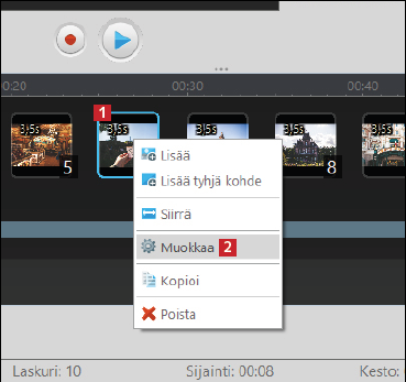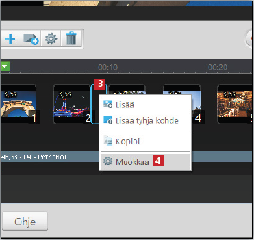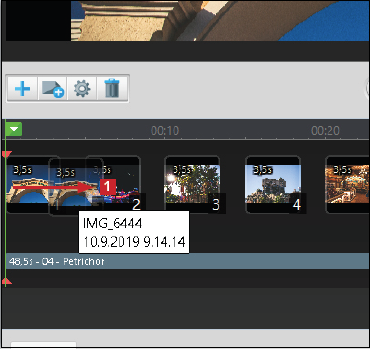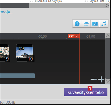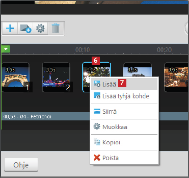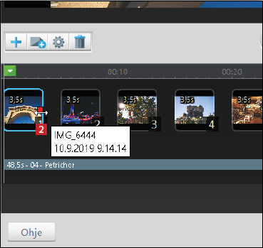 Kuvien järjestystä ja kestoa voi muuttaa pääikkunan alaosassa olevalla aikajanalla. Seuraavassa esitellään tärkeimmät yksityiskohdat, mutta ohjelmassa on paljon muitakin toimintoja, joiden avulla esityksestä saa luotua mieliinpainuvan.