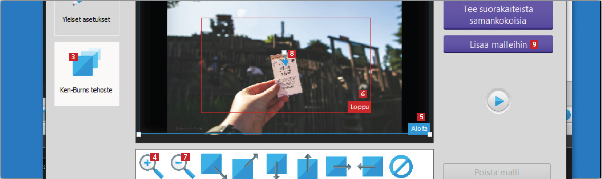 Olet ehkä jo huomannut, että ohjelma pystyy esimerkiksi zoomaamaan ja panoroimaan kuvia. Esitysten elävyyttä lisäävää efektiä kutsutaan Ken Burns -tehosteeksi. Alla näytämme, miten tehostetta käytetään.