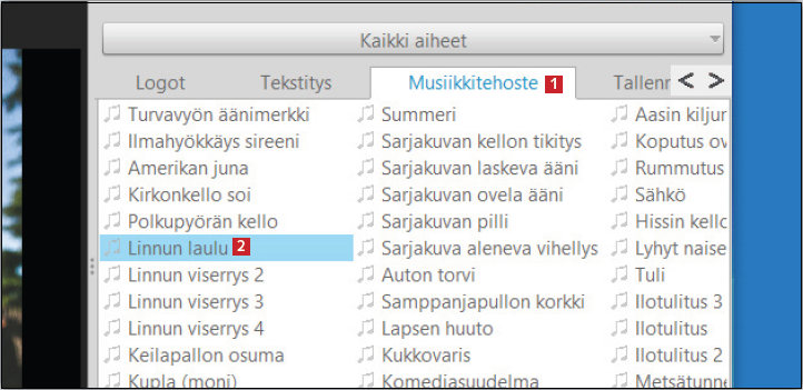 Musiikkitehoste-valikossa on noin sata erilaista tehostetta, jotka tuovat esityksiin todella hauskoja ääniä. Kokeile ja ihastu!