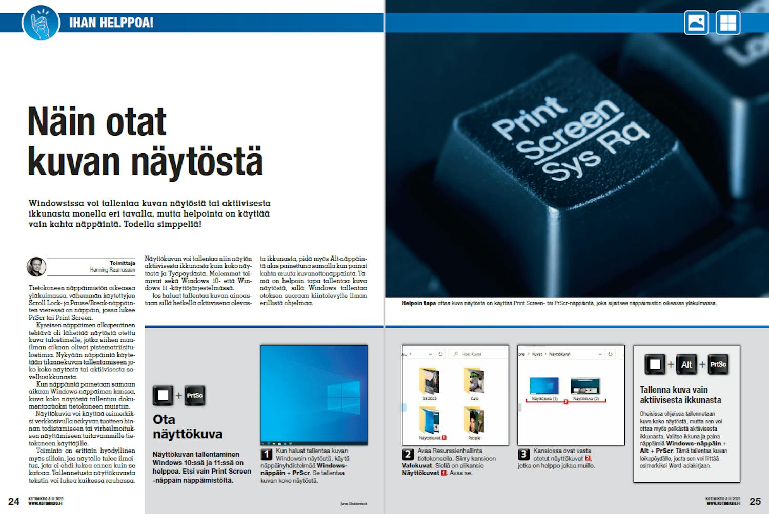 Molemmat toimivat sekä Windows 10- että Windows 11 -käyttöjärjestelmässä. Jos haluat tallentaa kuvan ainoastaan sillä hetkellä aktiivisena olevasta ikkunasta, pidä myös Alt-näppäintä alas painettuna samalla kun painat kahta muuta kuvanottonäppäintä. Tämä on helpoin tapa tallentaa kuva näytöstä, sillä Windows tallentaa otoksen suoraan kiintolevylle ilman erillistä ohjelmaa.