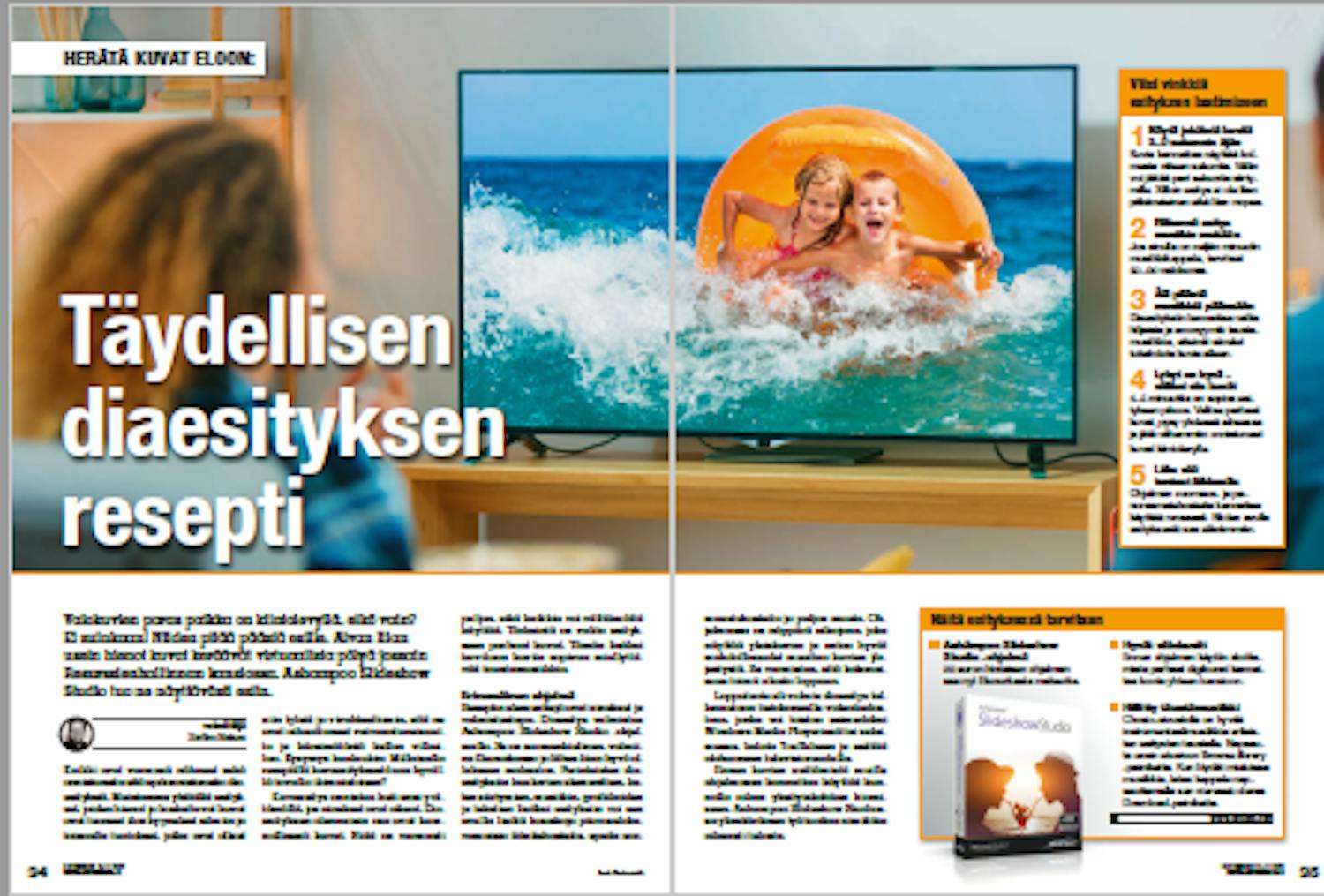 Reseptin elementtejä ovat ainekset ja valmistustapa. Diaesitys valmistuu Ashampoo Slideshow Studio -ohjelmalla. Se on suomenkielinen, valmiina Etunurkassa ja lähes liian hyvä ollakseen maksuton. Perinteisten dia-esityksiin kuuluvien elementtien, kuten siirtymien, musiikin, grafiikoiden ja tekstien lisäksi esityksiin voi sen avulla lisätä hauskoja piirroselokuvamaisia äänitehosteita, upeita zoomaustehosteita ja paljon muuta.
