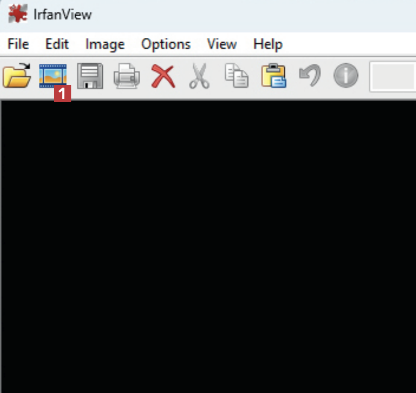 Aivan ensiksi täytyy ladata IrfanView verkkosivustoltamme ja asentaa se. Avaa sitten ohjelma ja napsauta filmikuvaketta 1 työkalurivillä ohjelmaikkunan yläosassa.