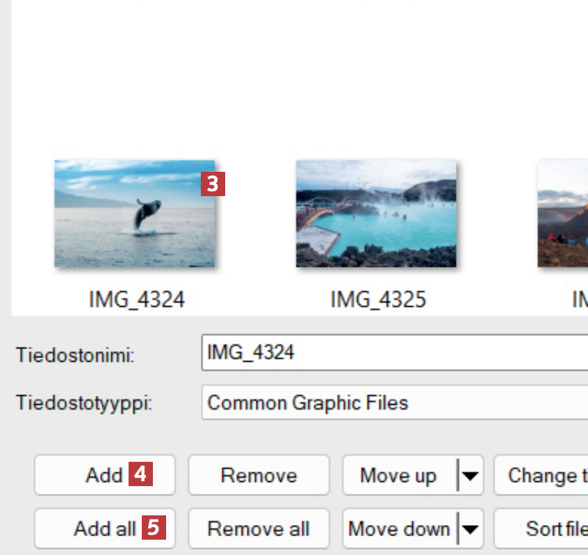 Voit lisätä yhden valokuvan kerrallaan napsauttamalla kuvaa 3 ja valitsemalla Add 4. Tässä lisäämme kaikki kansion valokuvat kerralla napsauttamalla painiketta Add all 5.