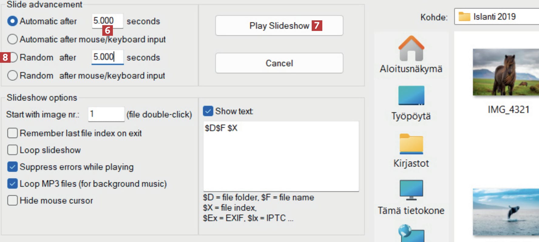 Valitse vasemmasta yläkulmasta, montako sekuntia 6 kuva näkyy kerrallaan esityksessäsi. Kun diaesitys on mielestäsi valmis näytettäväksi, napsauta kohtaa Play Slideshow 7. Kuvat näkyvät aakkosjärjestyksessä. Mikäli haluat, että ne näytetään satunnaisessa järjestyksessä, lisää valinta kohtaan Random 8 ennen kuin aloitat diaesityksen toiston.