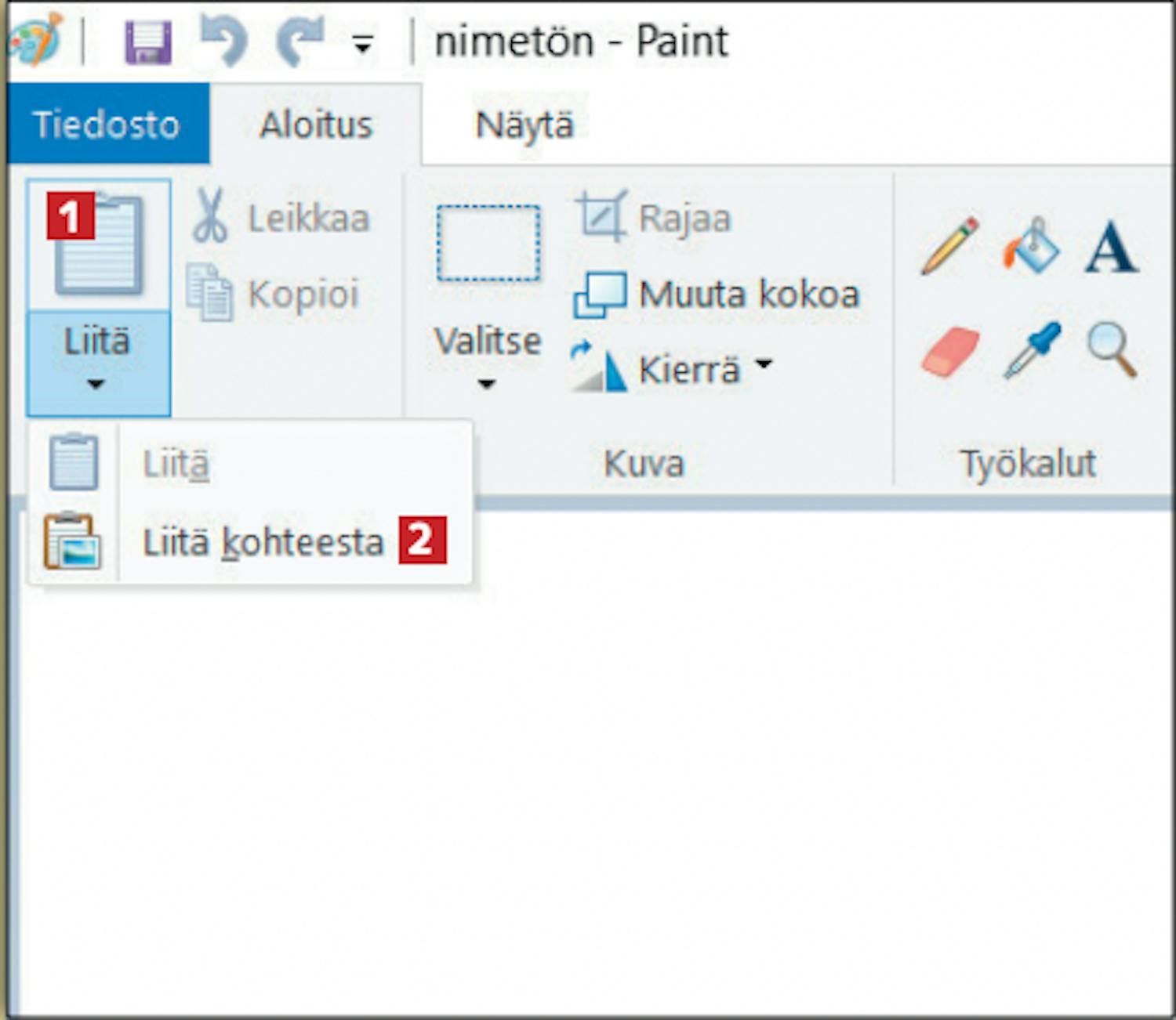 Etsi ohjelma kirjoittamalla Windowsin hakukenttään Paint ja valitse Paint. Napsauta kohtia Liitä 1 ja Liitä kohteesta 2.