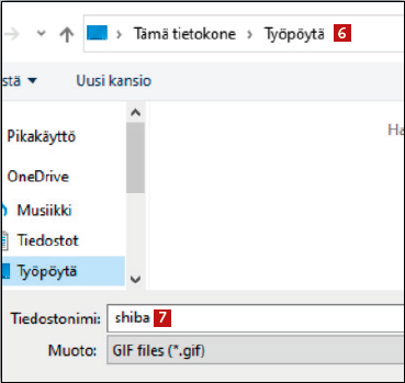 Ennen kuvaamisen aloittamista tiedosto täytyy tallentaa. Etsi sijainti 6 tietokoneella, anna GIF-animaatiolle nimi 7 ja napsauta Tallenna.