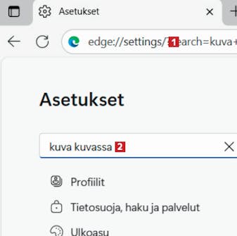 Kirjoita Edgen osoiteriville edge://settings 1 ja paina Enter-näppäintä. Kirjoita kuva kuvassa 2 ja paina Enter-näppäintä.