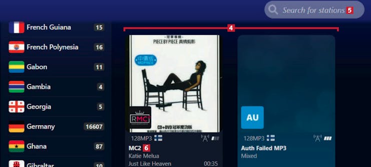 Suomen radiokanavat voit löytää keskellä sijaitsevasta yleiskatsauksesta 4. Huomaa myös mahdollisuus etsiä asemia niiden nimen perusteella 5. Kaksoisnapsauta radiokanavaa 6 toistaaksesi musiikkia.