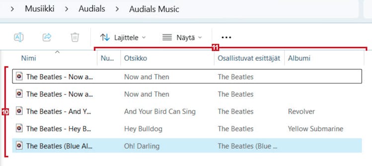 Tallennettua musiikkia voi kuunnella ohjelmassa, mutta Resurssienhallinnassa saat paremman yleiskuvan. Siirry kansioon C:\Users\xxxx\Music\Audials\Audials Music (korvaa xxxx omalla Windows-tunnuksellasi). Löydät kappaleet mp3-tiedostoina 10. Myös kappaleiden tiedot näkyvät 11. Kappaleita on muokattu niin, että juontajien puheet on poistettu musiikin edestä ja perästä.
