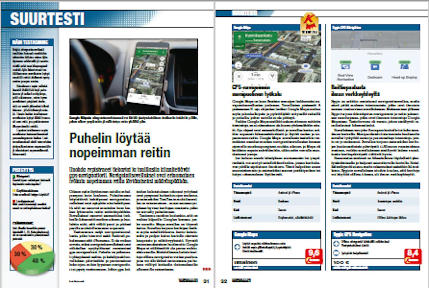 Testasimme neljä navigointisovellusta, jotka toimivat sekä Android-puhelimessa että iPhonessa. Ei ole vaikea arvata, miksi navigointisovellukset ovat vähitellen syrjäyttäneet varsinaiset gps-navigaattorit. Puhelin on jatkuvasti yhteydessä nettiin, ja kehittyneitä sovelluksia päivitetään ja parannetaan koko ajan, mihin fyysinen navigaattori ei pysty vastaamaan.