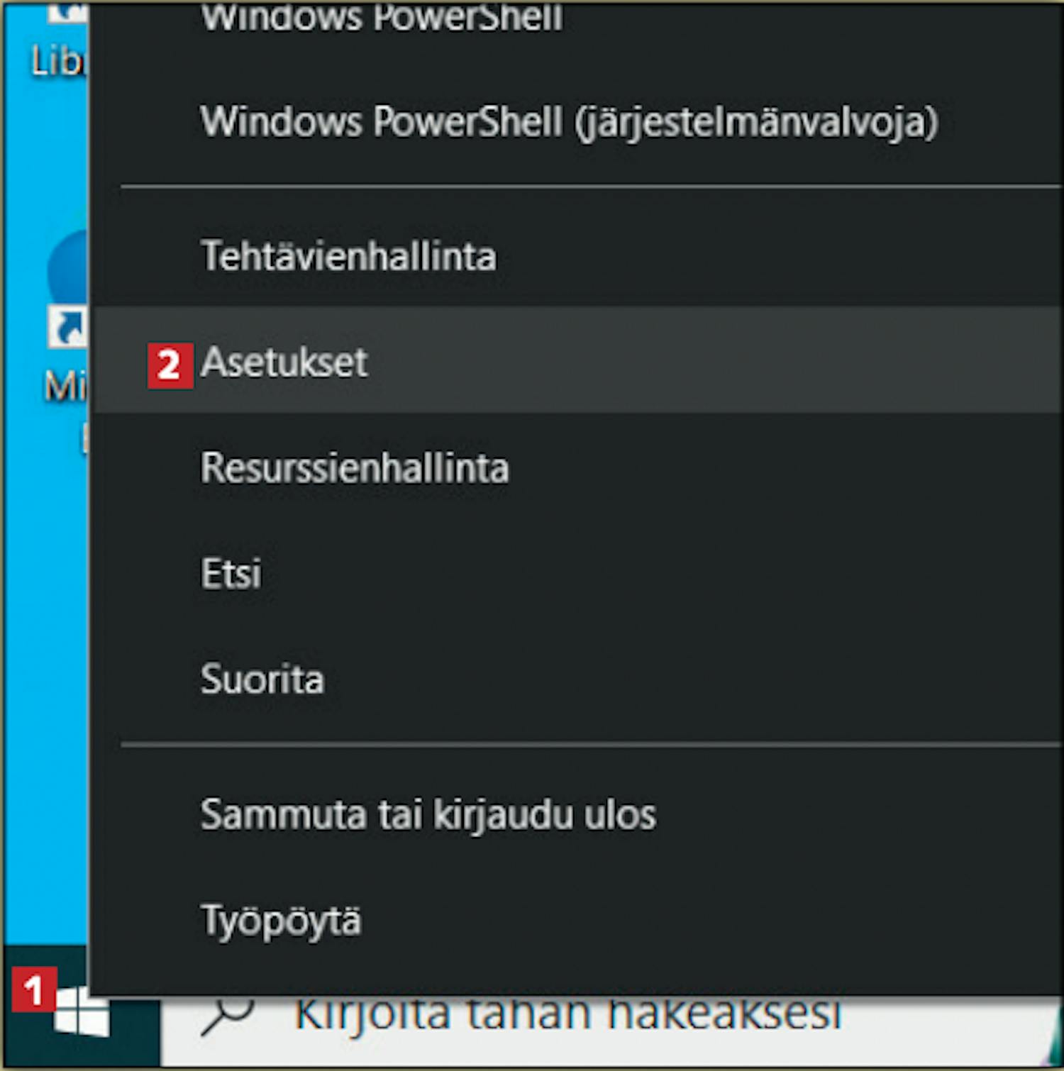 Avaa aloituspainikkeesta 1 hiiren kakkospainikkeella Asetukset 2 .