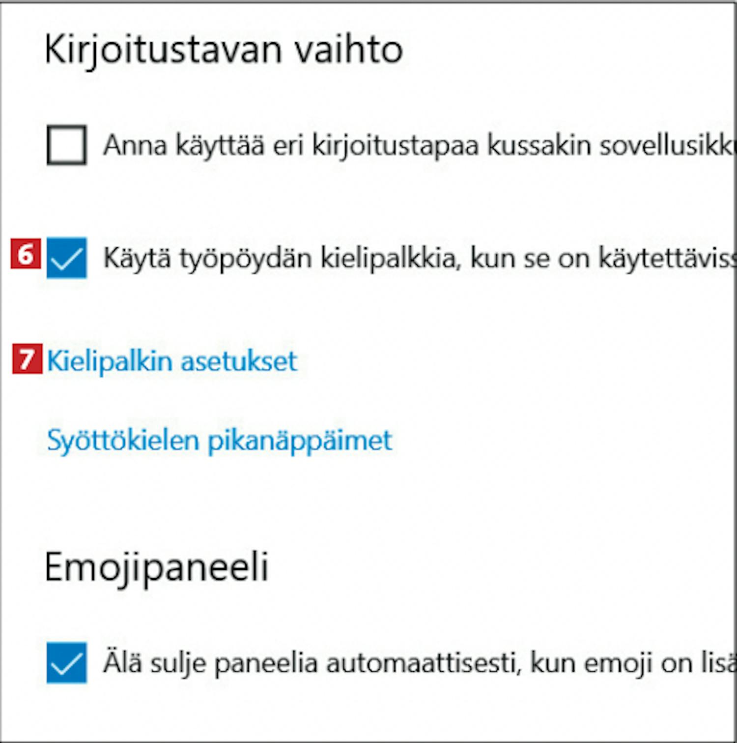 Merkitse kohta Käytä työpöydän kielipalkkia, kun se on käytettävissä 6 . Napsauta kohtaa Kielipalkin asetukset 7 .