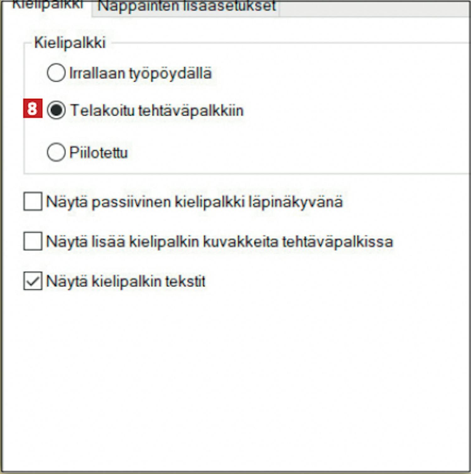Valitse kohta Telakoitu tehtäväpalkkiin 8 ja napsauta painikkeita Käytä ja OK. Tehtäväpalkkiin ilmestyy valikko, josta voit valita kielen.