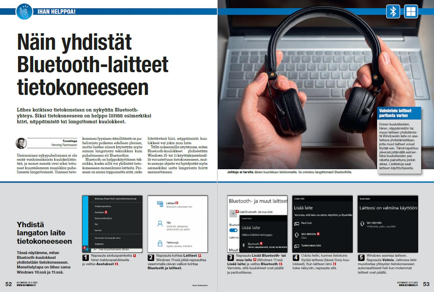 Prosessi on sama riippumatta siitä, onko liitettävänä hiiri, näppäimistö, kuulokkeet vai jokin muu laite. Tällä aukeamalla näytämme, miten Bluetooth-kuulokkeet yhdistetään Windows 10- tai 11-käyttöjärjestelmällä varustettuun tietokoneeseen, mutta samoja ohjeita voi hyödyntää myös esimerkiksi uutta langatonta hiirtä asennettaessa.