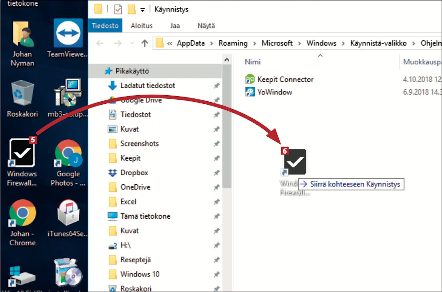 Vedä sitten ohjelmien pikakuvakkeita 5 Käynnistys-kansioon 6.