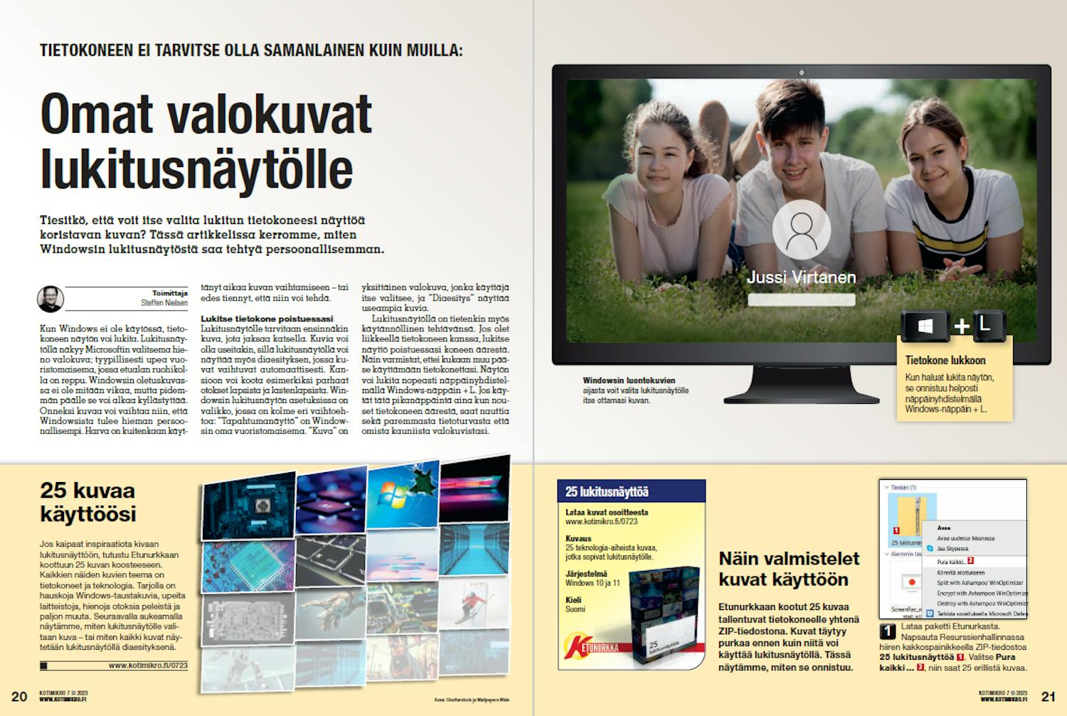 Kun Windows ei ole käytössä, tietokoneen näytön voi lukita. Lukitusnäytöllä näkyy Microsoftin valitsema hieno valokuva; tyypillisesti upea vuoristomaisema, jossa etualan ruohikolla on reppu. Windowsin oletuskuvassa ei ole mitään vikaa, mutta pidemmän päälle se voi alkaa kyllästyttää.