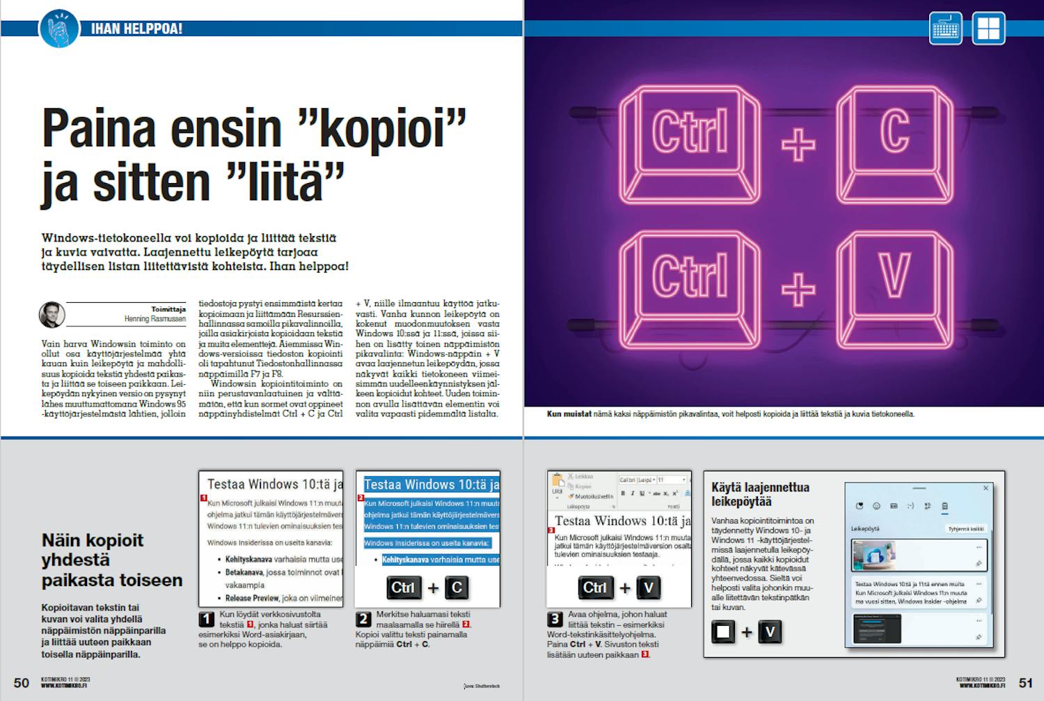 Vanha kunnon leikepöytä on kokenut muodonmuutoksen vasta Windows 10:ssä ja 11:ssä, joissa siihen on lisätty toinen näppäimistön pikavalinta: Windows-näppäin + V avaa laajennetun leikepöydän, jossa näkyvät kaikki tietokoneen viimeisimmän uudelleenkäynnistyksen jälkeen kopioidut kohteet. Uuden toiminnon avulla lisättävän elementin voi valita vapaasti pidemmältä listalta.