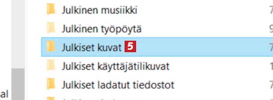 Julkinen-kansion alikansiot tulevat näkyviin. Kaksoisnapsauta vaikkapa Julkiset kuvat -kansiota 5.