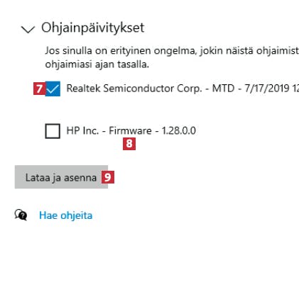 Merkitse ohjaimet, jotka haluat päivittää 7. Älä valitse BIOS- tai firmware-päivityksiä 8, sillä ne voivat aiheuttaa teknisiä ongelmia. Napsauta painiketta Lataa ja asenna 9.