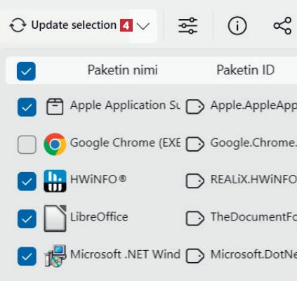 Näet luettelon kaikista päivityksistä. Poista merkintä sellaisten ohjelmien kohdalta, joista haluat syystä tai toisesta säilyttää vanhemman ohjelmaversion 3.