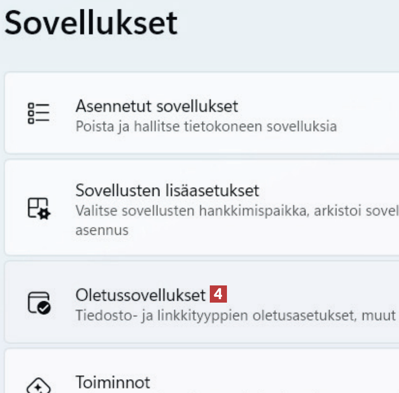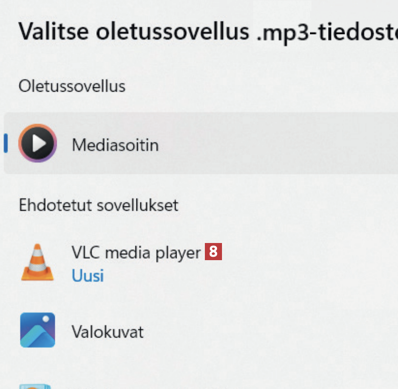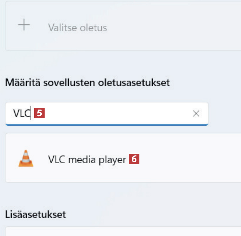 Kirjoita haluamasi ohjelman nimi kenttään Määritä sovellusten oletusasetukset 5. Napsauta kyseistä ohjelmaa 6.