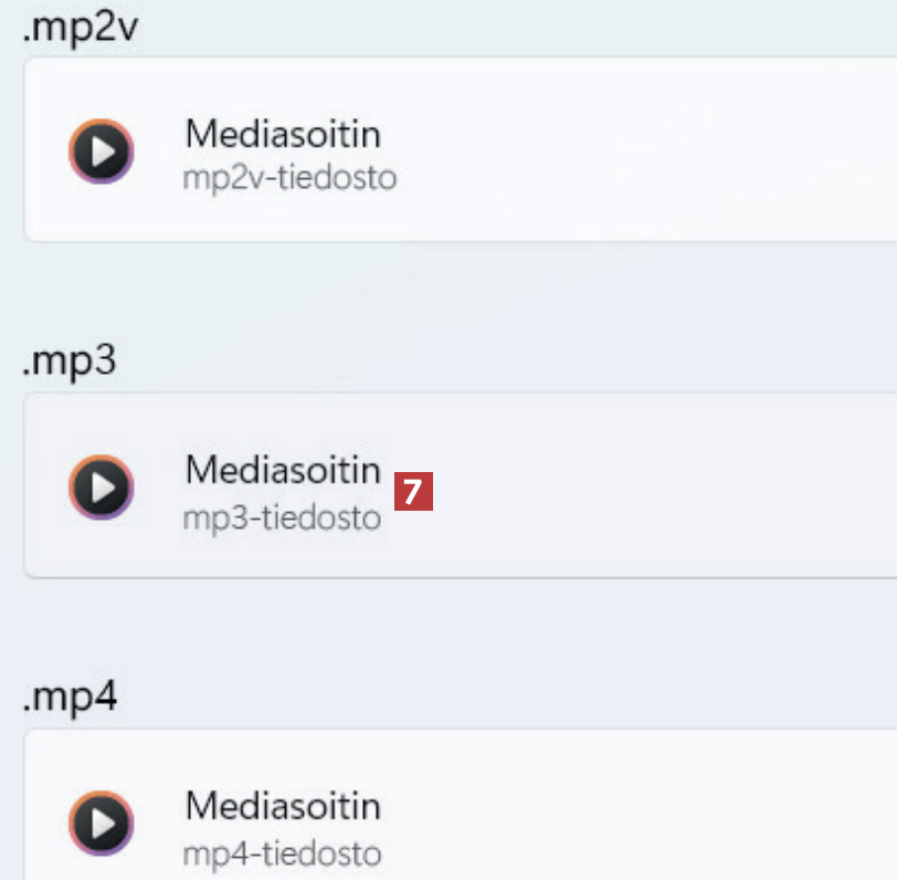 Selaa sitten tiedostotyyppejä ja valitse se tyyppi (tässä se on .mp3 7), jonka haluat sovelluksen avaavan oletuksena. Jokainen tiedostotyyppi on käytävä läpi erikseen.