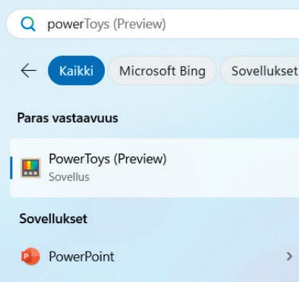 Command Paletten käyttö edellyttää, että tietokoneeseen on asennettuna Microsoftin Powertoys-työkaluohjelma. Päivitä Powertoys uusimpään versioon. Se on tärkeää, koska Command Palette on täysin uusi toiminto.
