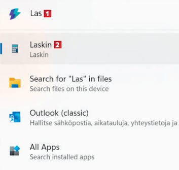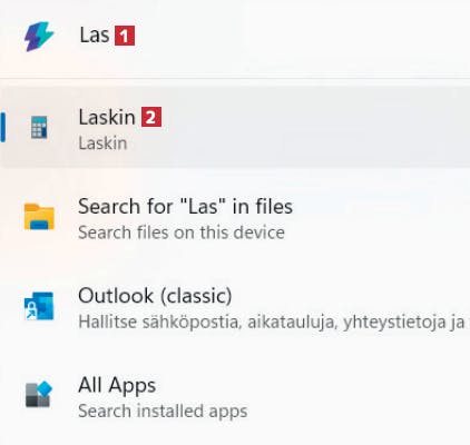 Ala kirjoittaa hakusanaa, kuten esimerkiksi las 1 , avataksesi ohjelman Laskin 2. Avaa ohjelma Enter-näppäimellä tai tyhjennä kenttä Esc-näppäimellä.