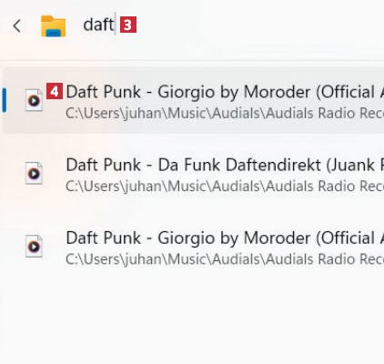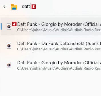 Jos haluat etsiä tallentamaasi tiedostoa tietokoneeltasi, ryhdy kirjoittamaan tiedoston nimeä, esimerkiksi daft 3. Sitten saat tulokseksi kappaleita kyseiseltä bändiltä Daft Punk 4.