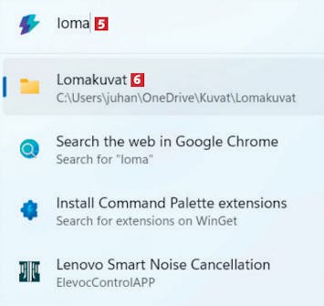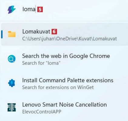 Voit etsiä Command Palettella myös kansioita. Kirjoita hakuun esimerkiksi loma 5 löytääksesi kansion Lomakuvat 6.
