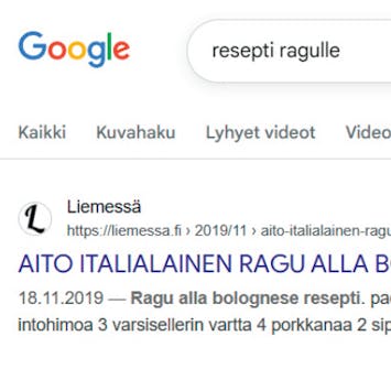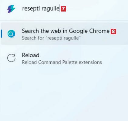 Jos haluat tehdä verkkohaun, kirjoita hakukenttään ??. Kun olet tehnyt sen, näet hakukuvakkeen 7. Kirjoita sitten hakusana, esimerkiksi resepti ragulle 8, ja paina Enter.