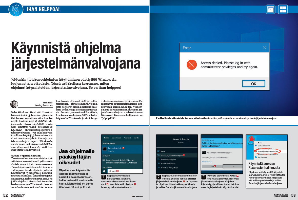 Joskus ohjelmat pitää pakottaa toimimaan järjestelmänvalvojana, jotta ne voivat luoda, poistaa ja muokata tiedostoja ja tietokoneen asetuksia. Se on tarpeen esimerkiksi silloin, kun komentokehotteen SFC-työkalua käytetään Windowsin ja kiintolevyn virheiden etsimiseen, ja siihen voi törmätä myös optimointiohjelmissa. Seuraavassa kerromme, miten Windowsin saa käynnistämään ohjelman järjestelmänvalvojana – sekä aloitusvalikosta että Resurssienhallinnasta tai Työpöydältä.