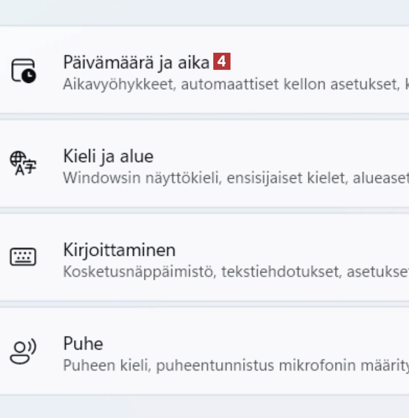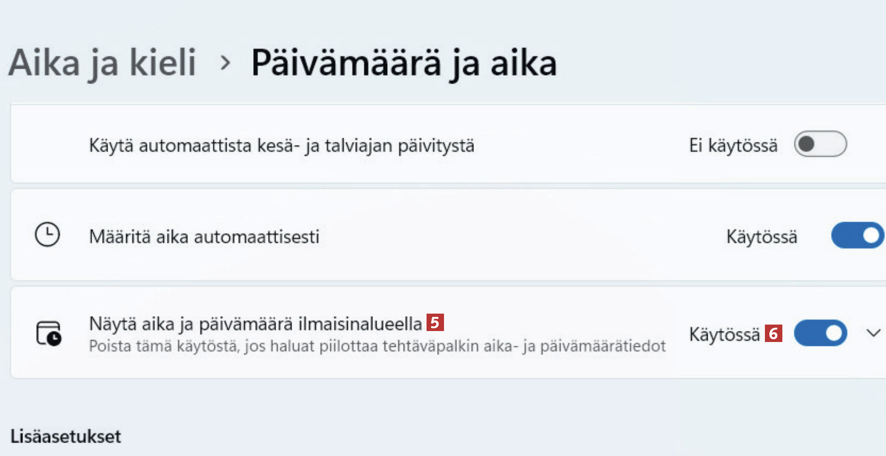 Oheislaitteet Käyttöjärjestelmä Windows 11 Kello on h... Kello on hävinnyt tehtäväpalkista Windows 11 -tietokoneessani ei näy kelloa oikealla puolella näytön tehtäväpalkissa Miten saan sen takaisin? Kirjoittaja Redaktionen - 31. elokuuta 2025 Tallenna artikkeli Du skal være logget ind for at gemme artikler. You need to login, before saving articles Tässä on vastaus ja vaiheittainen opas: Vastaus: Tämä johtunee siitä, että Windowsissa on asetus väärin. Näytämme tässä, miten saat kellon takaisin tavalliseen paikkaansa tehtäväpalkin oikealle puolelle. 1 Napsauta aloitusta 1 hiiren oikealla ja valitse Asetukset 2. 2 Valitse kohta Aika ja kieli 3. 3 Valitse sitten valikkokohta Päivämäärä ja aika 4. 4 Valitse kohdassa Näytä aika ja päivämäärä ilmaisinalueella 5 liukukytkimellä tilaksi Käytössä 6. 5 Kello tulee taas näkyviin tuttuun paikkaan ilmoitusalueelle 7.
