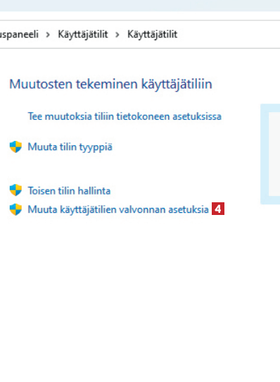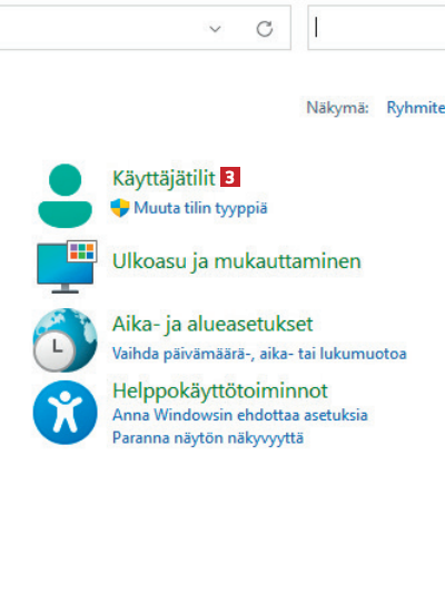 Napsauttamalla kohtaa Käyttäjätilit 3 avautuu valikko. Napsauta kyseisessä valikossa taas kohtaa Käyttäjätili.