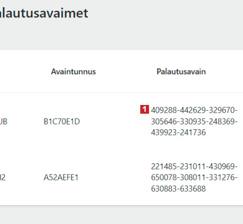 Mene osoitteeseen [https://aka.ms/](https://aka.ms/) myrecoverykey ja kirjaudu sisään. Näet tietokoneesi avaimen 1 , jossa on 48 lukua. Kirjoita se avataksesi tietokoneen lukituksen.