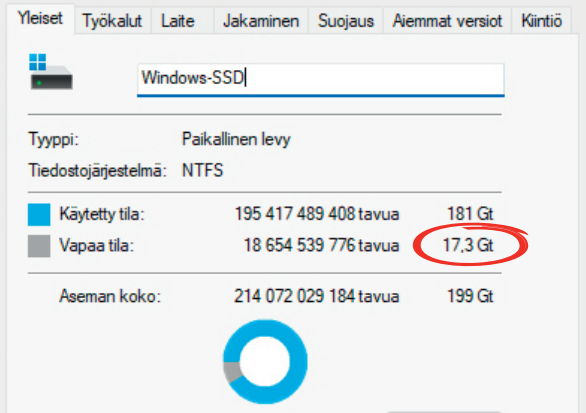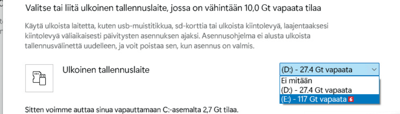 Tässä kohtaa toinen usb-muistitikku astuu mukaan kuvioon. Näet tämän ikkunan, jos tietokoneellasi on liian vähän tilaa päivityksen asentamiseen. Sinulle ehdotetaan