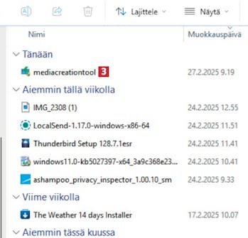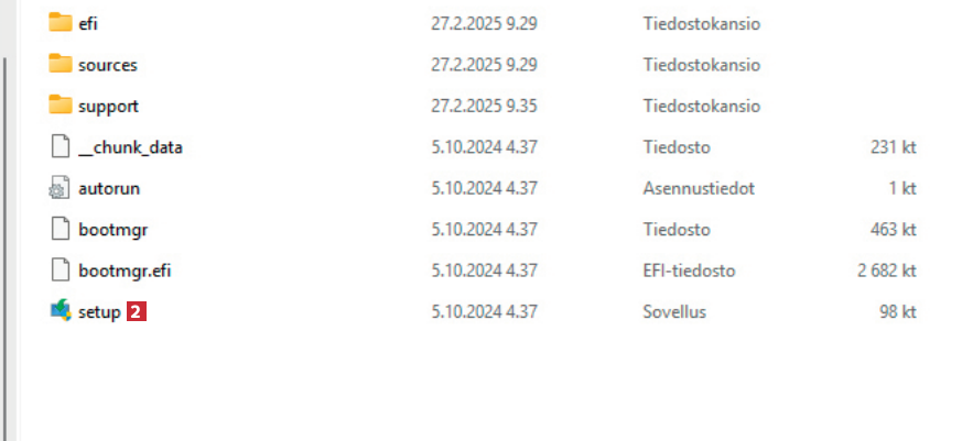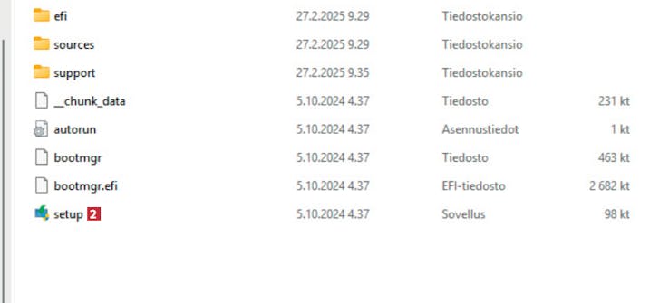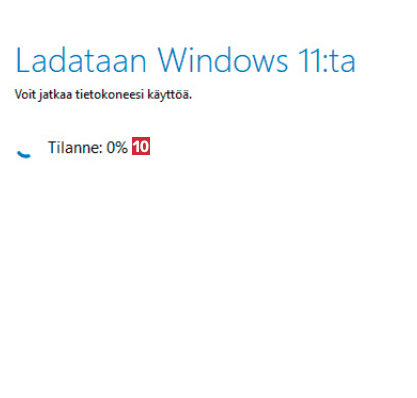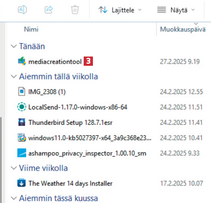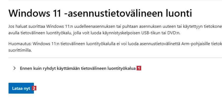 Mene selaimellasi osoitteeseen microsoft.com/fi-fi/softwaredownload/windows11. Napsauta sitten kohdan Ennen kuin ryhdyt käyttämään tietovälineen luontityökalua 1 alta painiketta Lataa nyt 2. Tietokoneellesi ladataan tiedosto.