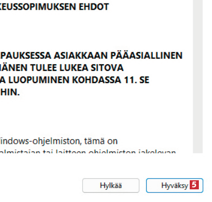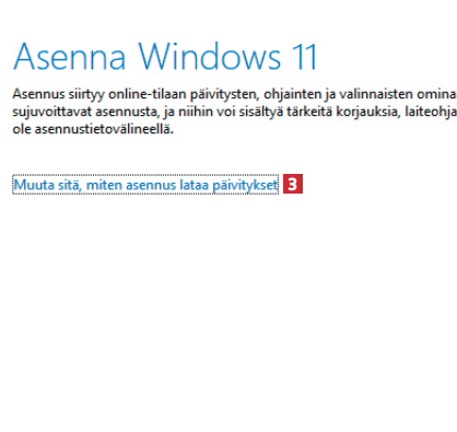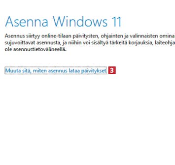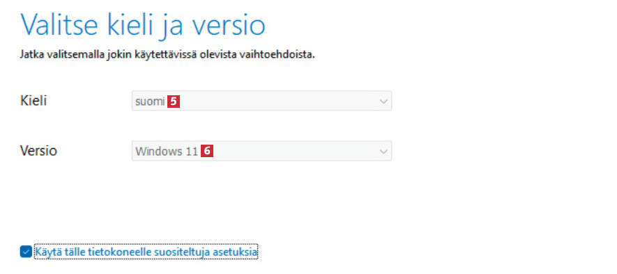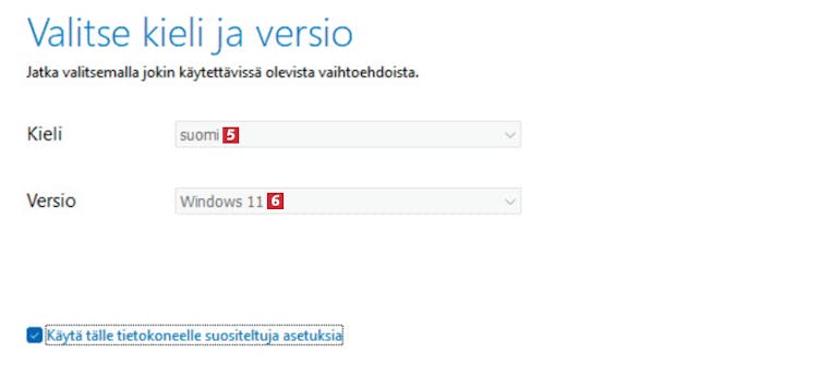 Valitse suomi 5 ja Windows 11 6, jotta uusi versio asennetaan tietokoneellesi suomenkielisenä. Napsauta sitten painiketta Seuraava.