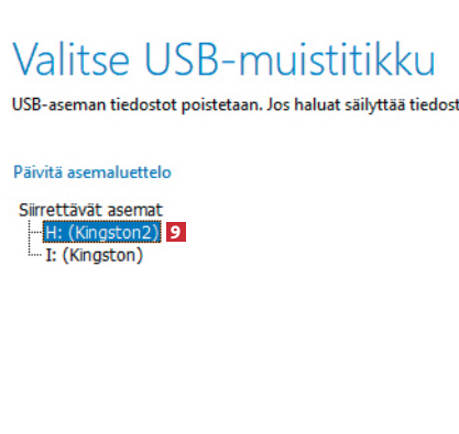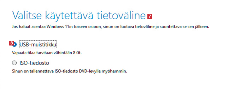 Liitä ensimmäinen usb-tikku tietokoneeseen. Kun etenet ikkunaan Valitse käytettävä tietoväline 7, valitse vaihtoehto USB-muistitikku 8.