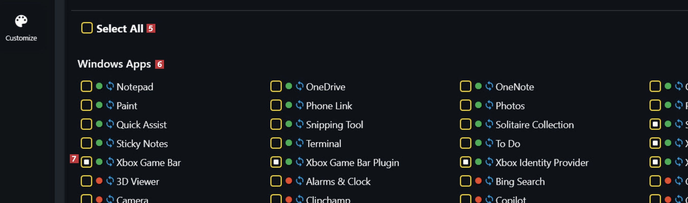 Poista merkintä kohdasta Select All 5. Käy läpi Windows Apps 6 -luettelon vihreällä merkityt ohjelmat. Merkitse 7 siis ohjelmat, jotka haluat poistaa. Huomaa kuitenkin, että lista saattaa näyttää erilaiselta sinun laitteellasi riippuen siitä, mitä ohjelmia tietokoneellasi on asennettuna.
