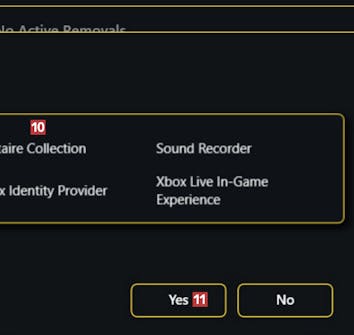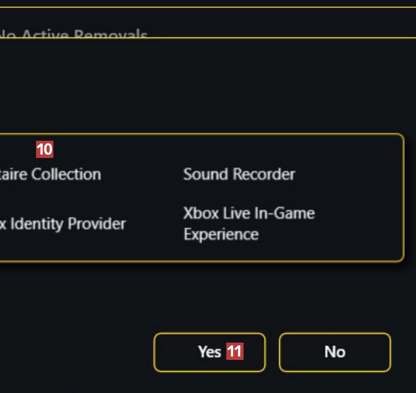 Avautuvasta ruudusta 10 näet vielä kerran poistettavat ohjelmat. Vahvista valintasi napsauttamalla painiketta Yes 11.