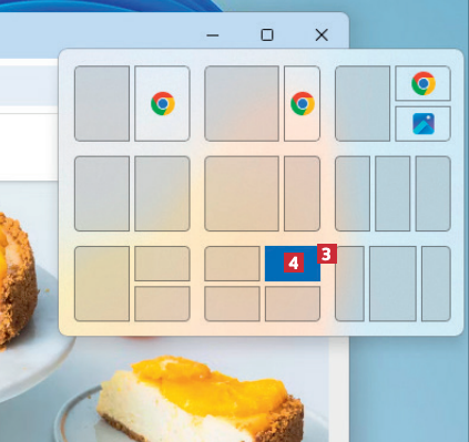 Näytöllä näkyy nyt läpikuultavina ruutuina kolme sijoitusehdotusta ikkunallesi. Vapauta hiiren painike, kun ikkunasi on värjännyt haluamasi ruudun siniseksi 2.